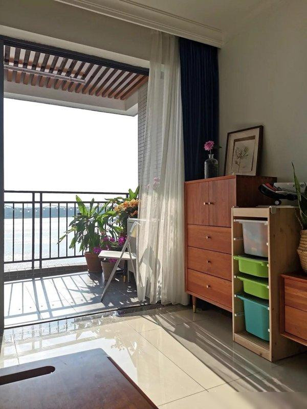楼下的广场舞音乐根本听不到,周末想睡懒觉就睡懒觉;阳台改成了书房,放个书桌,能看江景,还安静,她现在每天都在阳台办公;夏天拉上遮阳帘,坐在阳台的吊椅上,吹着风,比客厅还凉快;冬天的时候,阳台的温度比客厅高5度,放盆多肉都能长得好好的。